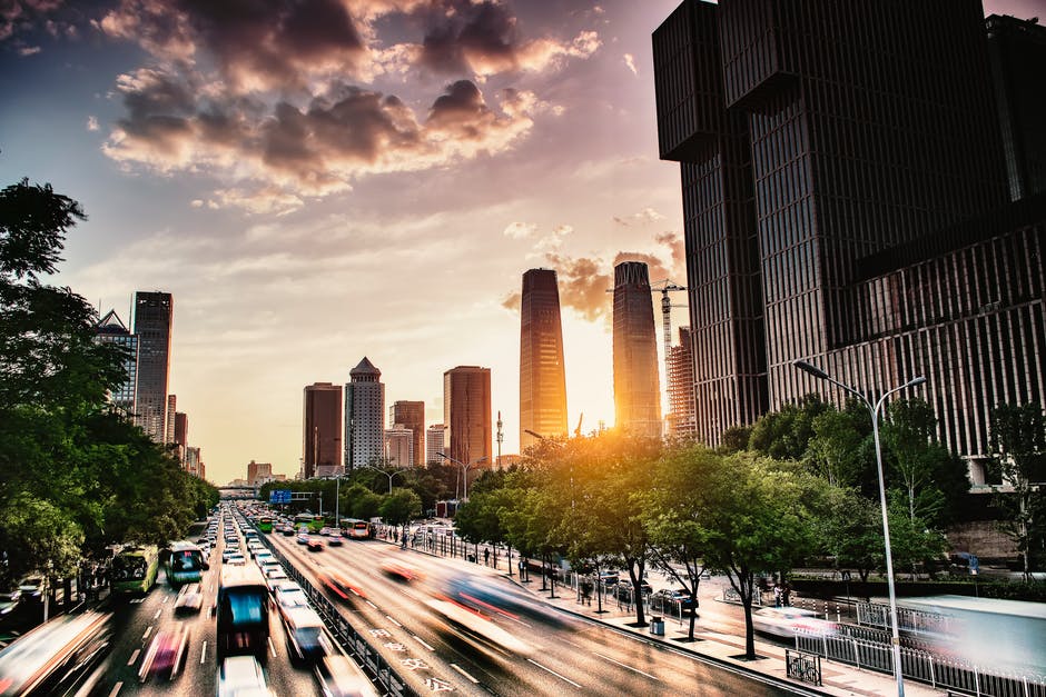 日落时建筑物附近街道上车辆的延时摄影 · 免费素材图片