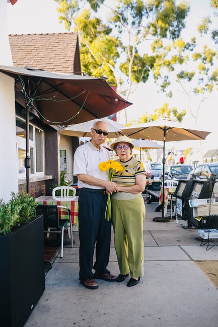 老年夫妇手牵着鲜花花束 · 免费素材图片