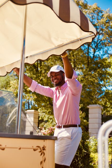 休息在公园的室外自助餐厅附近的年轻黑人微笑 · 免费素材图片