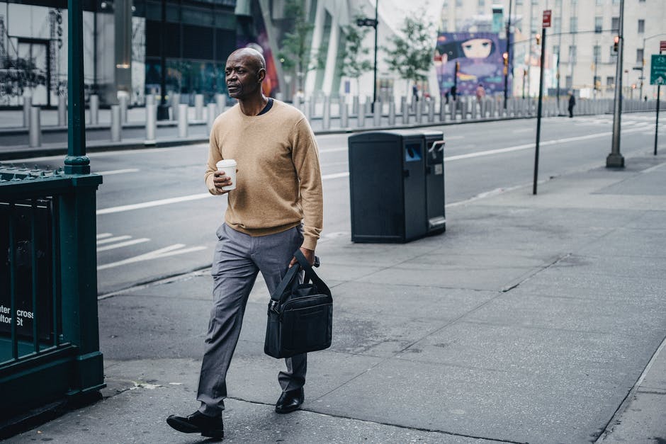 严重的黑人男子,在咖啡的人行道上行走 · 免费素材图片