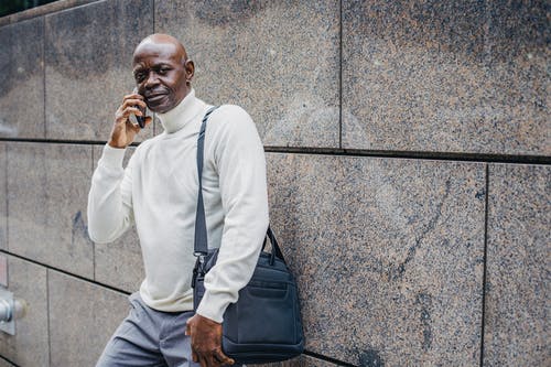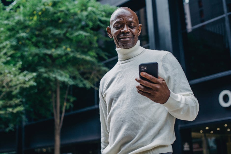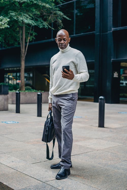 性格开朗的黑人男子,在大街上浏览智能手机 · 免费素材图片