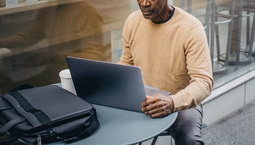 播种时髦的非洲裔美国人,在街边咖啡馆使用便携式计算机 · 免费素材图片