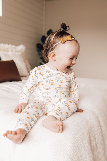 可爱的宝宝在床上冷笑着 · 免费素材图片