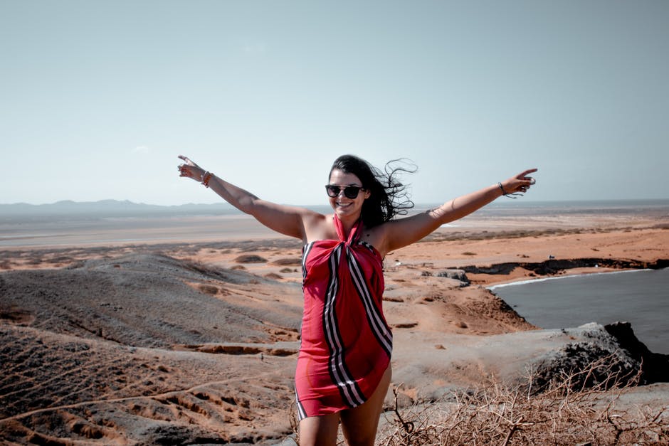 穿红色和白色吊带裙站在沙丘中间的女人 · 免费素材图片