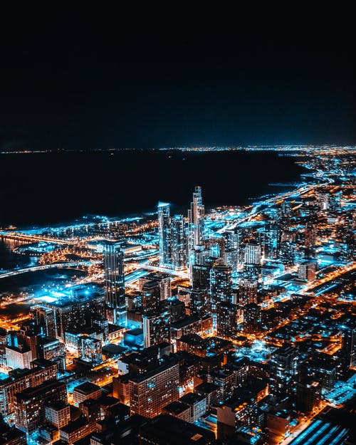 夜间打开灯光的城市建筑物的航拍 · 免费素材图片