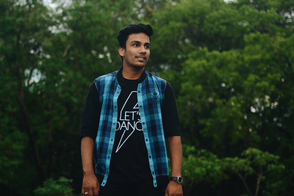 穿蓝色和黑色衬衫站在树旁的人 · 免费素材图片