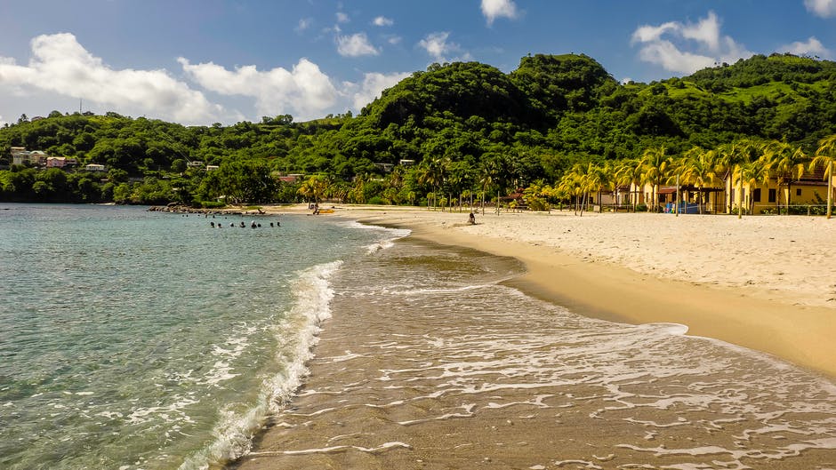 多云的天空下绿山附近的海滩照片 · 免费素材图片