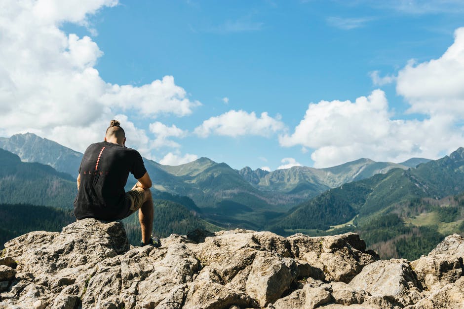 男子坐在山脉内的岩石上 · 免费素材图片