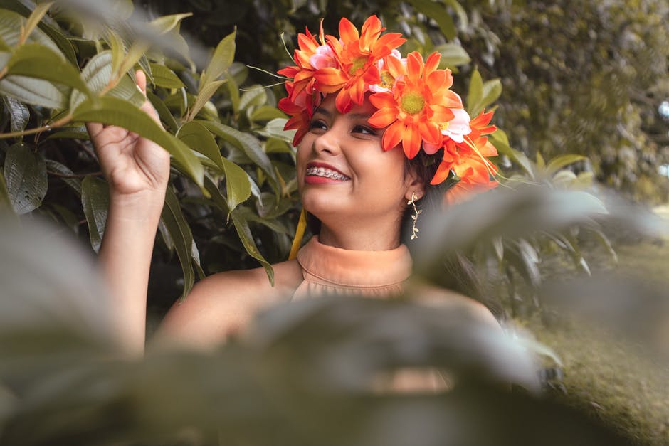 微笑的女人,穿着橙色的花头饰 · 免费素材图片