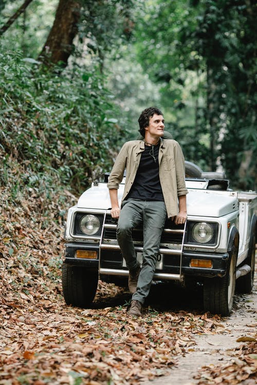 坐在汽车座椅上的蓝色牛仔夹克和蓝色牛仔牛仔裤的男人 · 免费素材图片