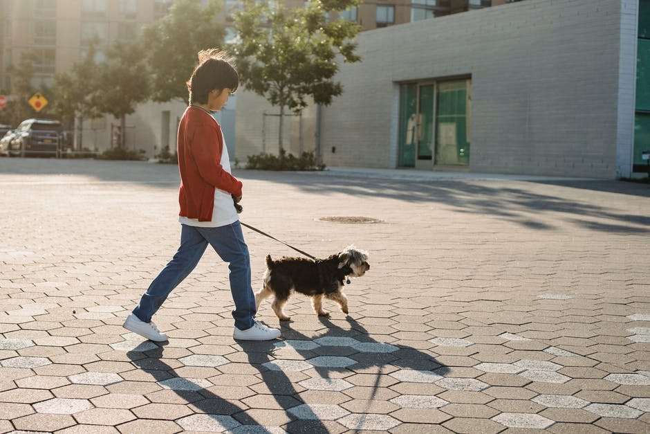 认不出来的男孩与纯种狗在城市路面上行走 · 免费素材图片