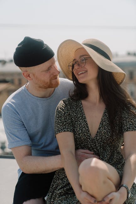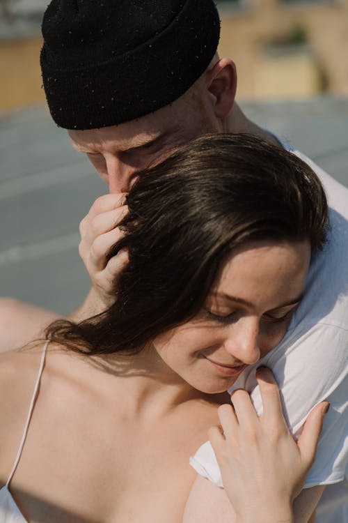 穿着蓝色圆领t恤的男人,旁边穿着黑色和白色花裙的女人 · 免费素材图片