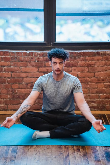 穿着灰色圆领t恤和黑色的裤子,坐在蓝色瑜伽垫上的男人 · 免费素材图片