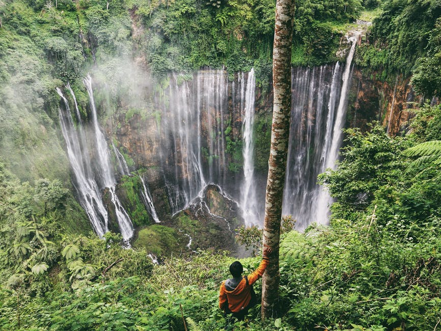 不可识别的旅行者在夏天欣赏绿色山脉的快速瀑布 · 免费素材图片
