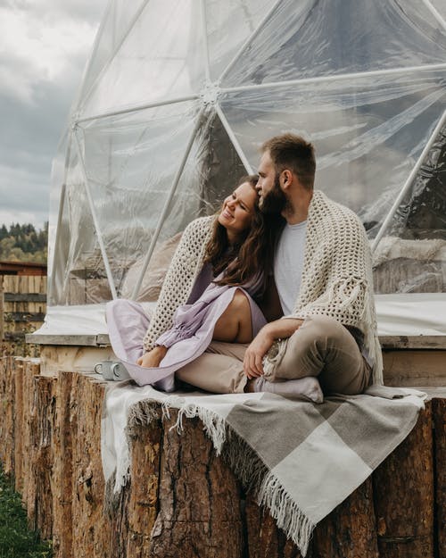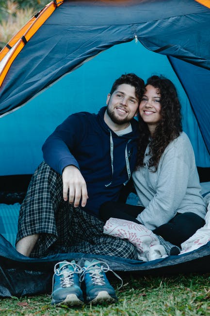 坐在黑色和白色外套的微笑的妇女坐在蓝色和黑色帐篷 · 免费素材图片