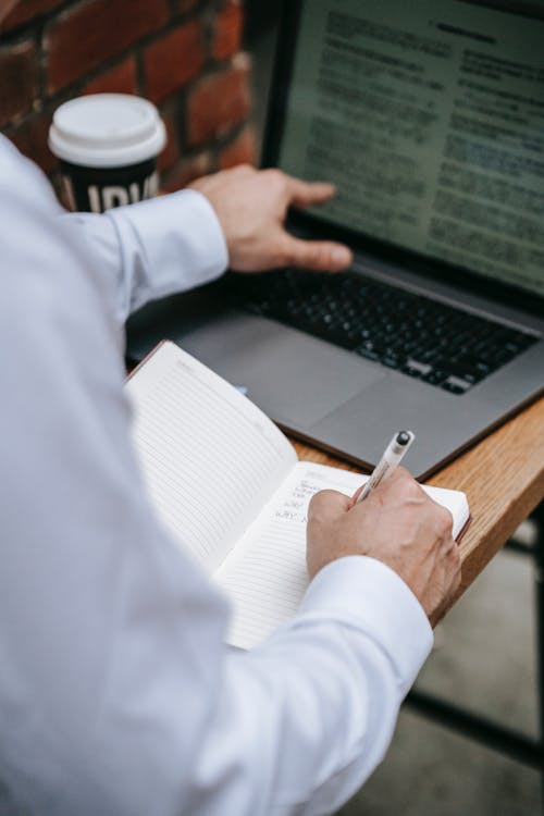 红色毛衣的人在棕色的木桌上使用macbook Pro · 免费素材图片