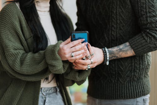 拿着智能手机的灰色毛线衣的人在灰色毛线衣旁边妇女 · 免费素材图片