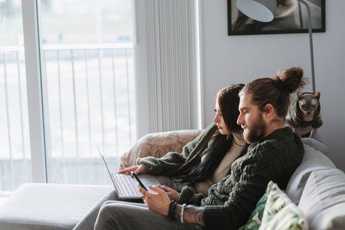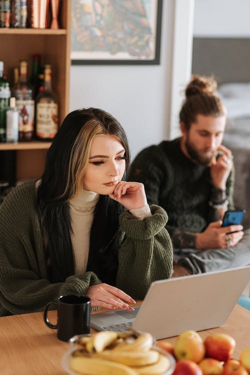 黑色的长袖衬衫,坐在灰色的沙发上的女人 · 免费素材图片