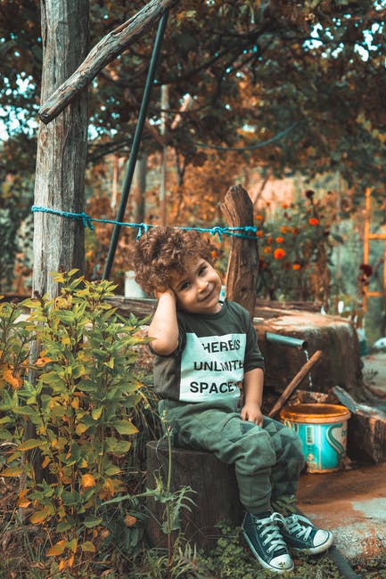 微笑的男孩坐在棕色凳子上 · 免费素材图片