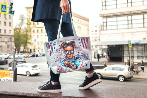 拿着白色和蓝色皮革手提袋的人的浅焦点照片 · 免费素材图片