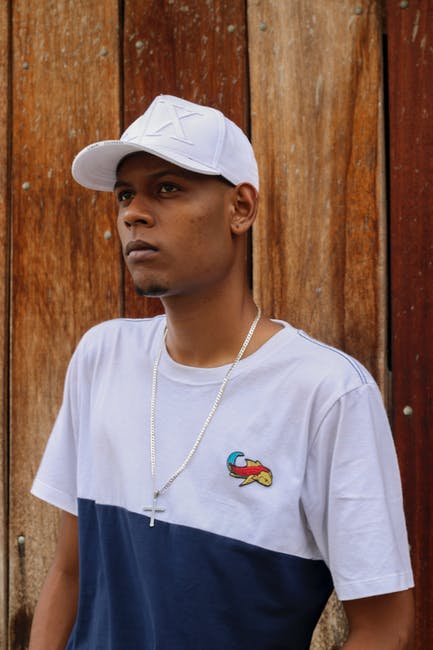 站在木墙旁边的白色和蓝色的t恤和白色的帽的人的照片 · 免费素材图片
