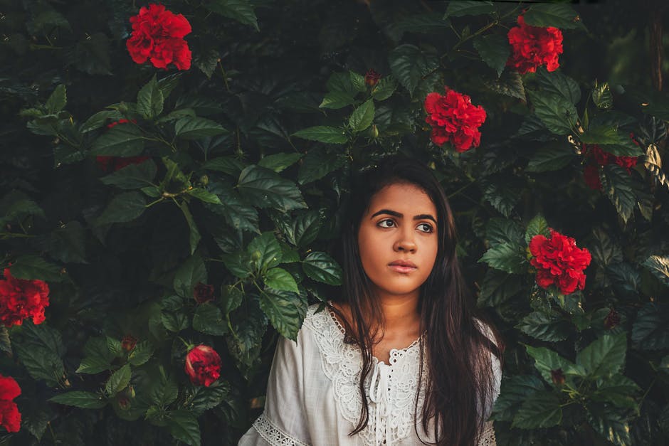 站在前面的红色花瓣花上的女人 · 免费素材图片