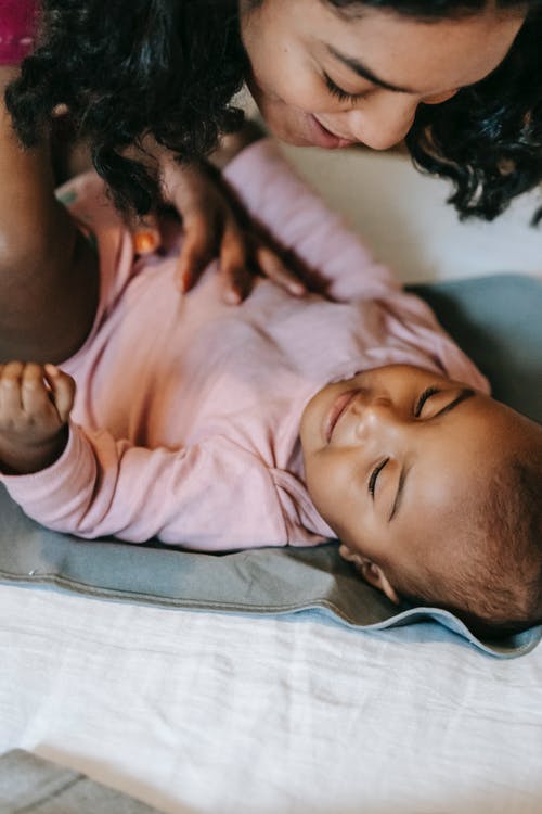 躺在白色的床上的粉红色onesie婴儿 · 免费素材图片