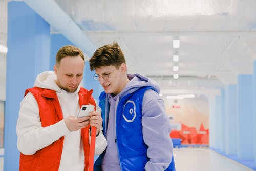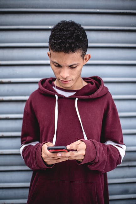 栗色连帽衫的人在前卷帘门中使用智能手机 · 免费素材图片