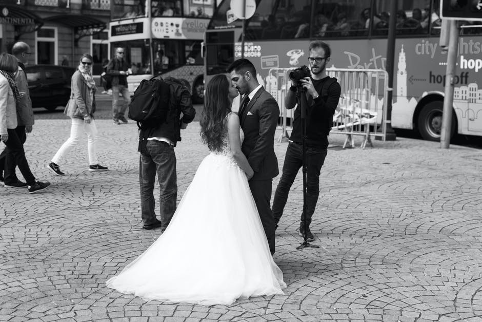 穿着黑色西装的男人的灰度摄影亲吻穿着白色婚纱的女人 · 免费素材图片