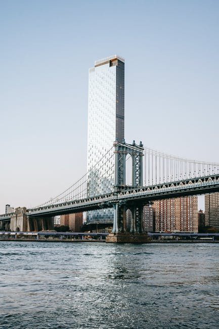 悬索桥和河后面的玻璃摩天大楼 · 免费素材图片
