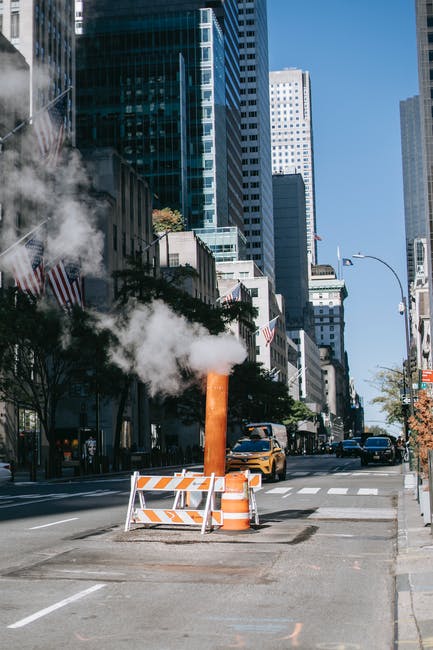 蒸气管在摩天大楼之间的道路上阳光灿烂的日子 · 免费素材图片