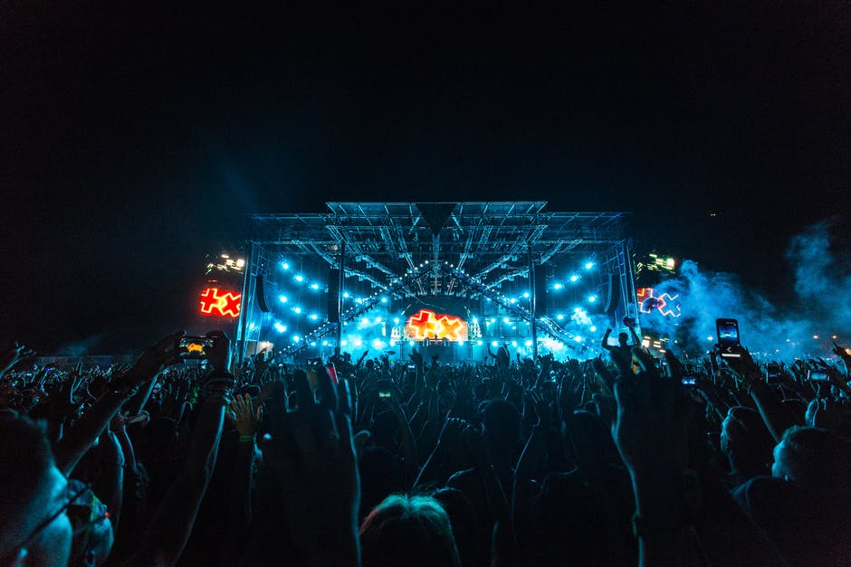 夜间音乐会期间,人群挤在蓝色和橙色的舞台前 · 免费素材图片