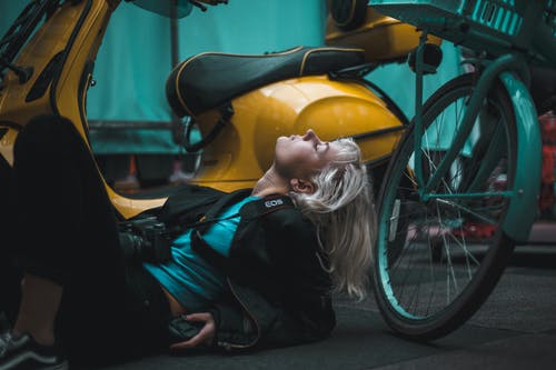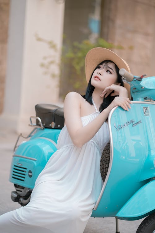 女人在米色的小型摩托车上戴头盔 · 免费素材图片