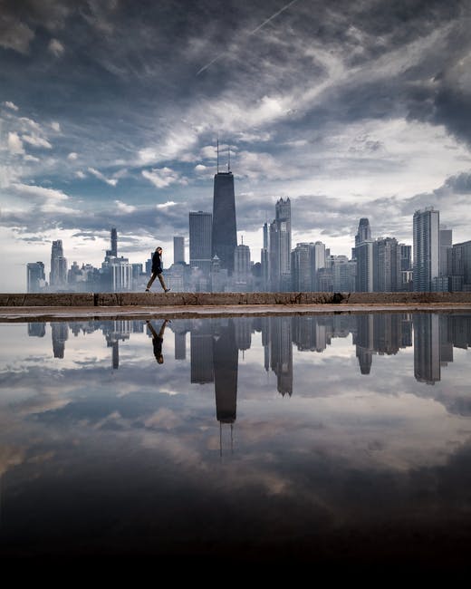 女人走在堤防湾俯瞰城市建筑 · 免费素材图片