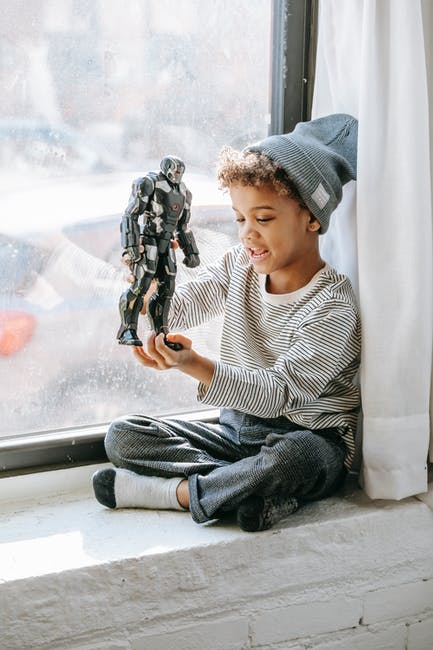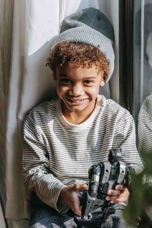 白色和黑色条纹毛衣和蓝色牛仔牛仔裤,坐在地板上的男孩 · 免费素材图片