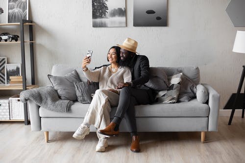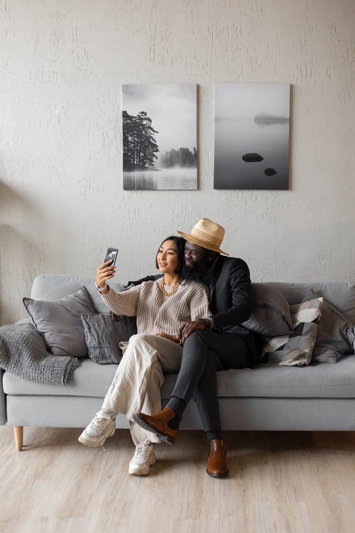 白色针织毛衫和米色帽子坐在灰色的沙发上的女人 · 免费素材图片