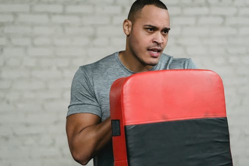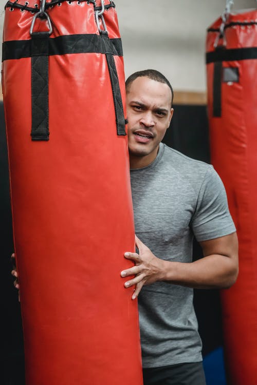 灰色乘员脖子上的t恤的男子戴着黑色拳击手套 · 免费素材图片