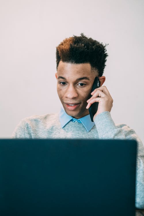 使用黑色便携式计算机的蓝色和白色格子衬衫的男人 · 免费素材图片