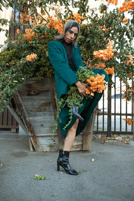 拿着花束的蓝色西装外套的女人 · 免费素材图片