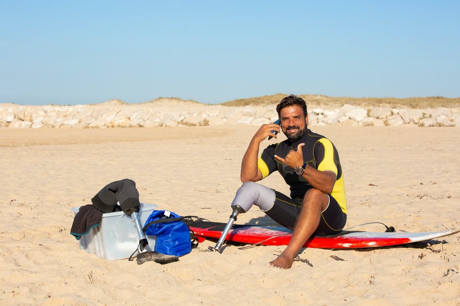 有腿假肢的人谈话在电话和显示shaka · 免费素材图片