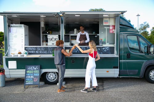 不同的夫妇吃街头食品和卖方交谈 · 免费素材图片