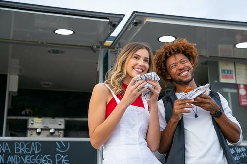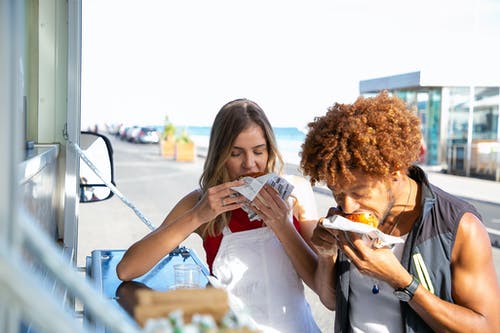 多种族的夫妇一起在午餐时间咬汉堡包 · 免费素材图片