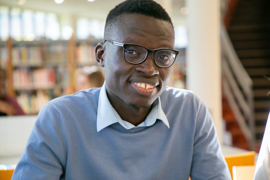 眼镜的微笑的黑人学生在教室的礼服 · 免费素材图片