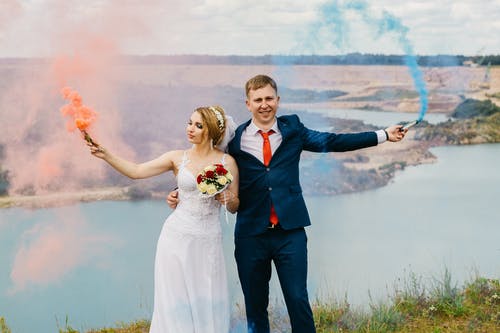 新娘和新郎骑摩托艇 · 免费素材图片