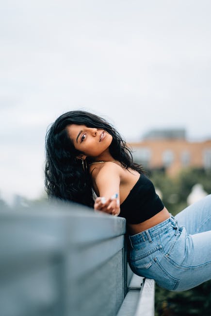 在金属栏杆上向后倾斜的黑色作物上衣和蓝色牛仔裤的女人的照片 · 免费素材图片