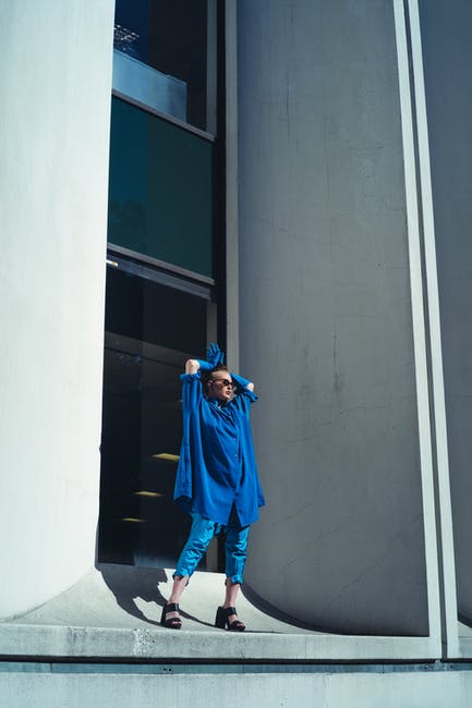 蓝色上衣和蓝色踏板短站在建筑玻璃窗旁的人 · 免费素材图片