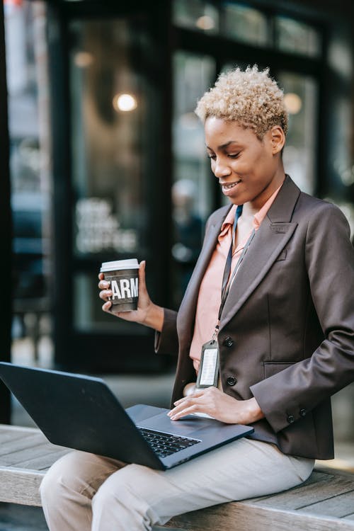 拿着白色陶瓷杯子的黑外套的女人 · 免费素材图片