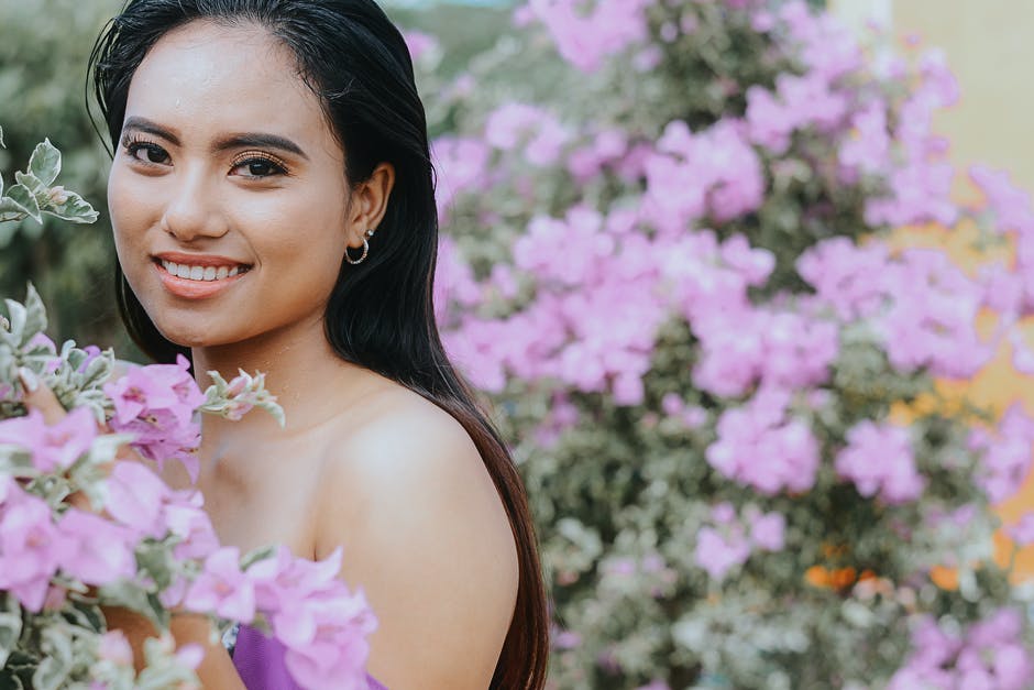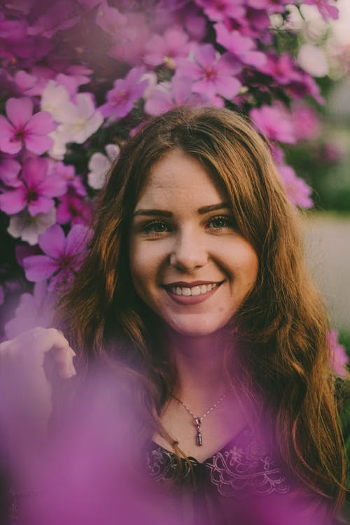 在粉红色的花朵旁边微笑的女人 · 免费素材图片