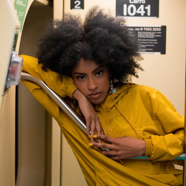 女人穿着黄色夹克,倚在金属棒上 · 免费素材图片