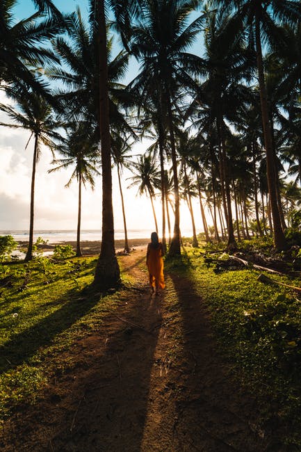在日落时分在椰子树中行走的女人的风景照片 · 免费素材图片
